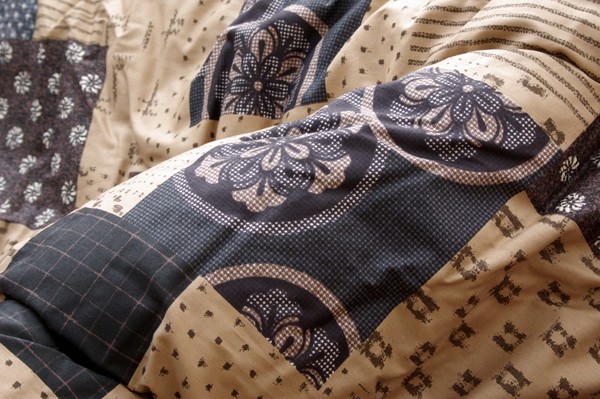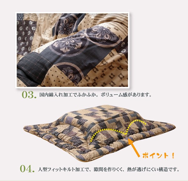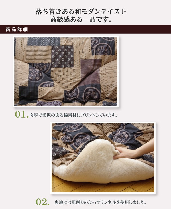 和モダン柄の日本製こたつ布団です。こちらの商品は国内でプリント、綿入れをしています。日本製のプリントらしい上質な質感と繊細な柄をお楽しみ下さい。生地には肉厚で張りと光沢のある綿素材を使用しています。綿はポリエステルに比べ静電気が起きにくく、繊維の中でも特に肌触りがよいのが特徴です。暖かさにもこだわり、裏地にはフランネルと呼ばれる、しっとり柔らかな肌触りの生地使用しています。また、敷き布団の中材のポリエステルわたの重量は、一般的な重量の(メーカー比)約1.4倍の増量タイプで、しかも通常のわたよりもヘタリにくい、固わたを使用しています。コタツに出入りする際に熱が逃げにくいフィットキルト加工を施しています。部分暖房のこたつは電気代もおトクです。