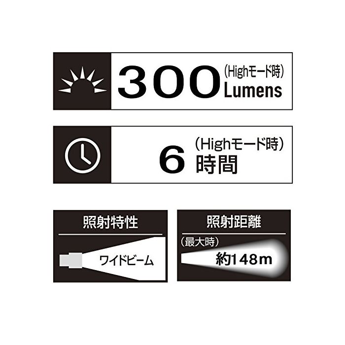 실용 점등:Hi/6시간,Mid/13시간,Low/16시간,슬로우 점멸/50시간