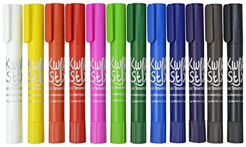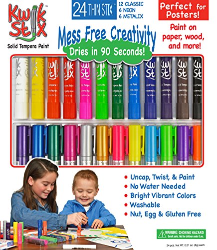Now introducing Kwik Stix thin Stix! paint with finer detail using these new solid Tempera paint sticks without the mess. No cups, smocks, water or brushes required. Kwik Stix have a fast drying formula that will allow them to dry in 90 seconds while still leaving a paint-like finish! Kwik Stix come in assorted vibrant colors with coverage that won't crack. Great on poster paper, cardboard, wood and canvas. 24 pack contains 12 classic, 6 neon and 6 metallic colors.