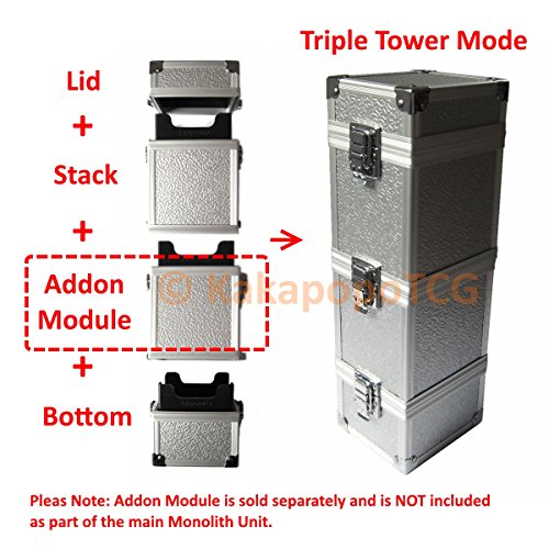 -. Feature : "The Monolith" KM-T01 Metal Deck Box. Can be used as a single deck box, or double deck box, or triple deck box (when you purchase 1x Add-on Unit), or even a bigger tower with multiple Add-on Units. / Add-on Units can be purchased to increase stack size to create a Deck Tower! / Video Demonstration link: https://www.youtube.com/watch?v=T8fIH4Kt_YM&t=0s / Fits 200+ double sleeved cards or 400+ un-sleeved cards. Card Tray Inner Dimensions: 95mm x 70mm x 60mm. Double Mode Overall External dimensions: 185mm x 100mm x 90mm. / Comes with: 2x Card Trays, 1x Deck Tower Lid, 1x Deck Tower Base, 1x Deck Tower Body.
