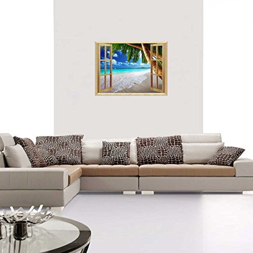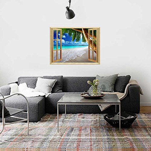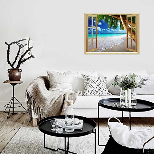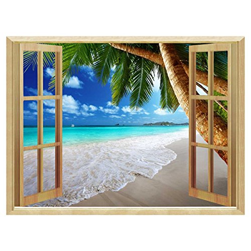 Uniquebella 3D Wall Sticker Decal Fake Window View of Tropical Beach with Palm Tree Mural Wallpaper Peel & Stick 24"x32"
