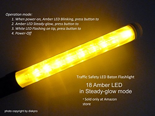 14.5 inch Amber LED Traffic Safety Wand Flashlight. Featured 18 Amber LED with 2 flashing modes (Blinking & Steady-glow) plus 1 White LED on tip, using 3 AA-size batteries.
