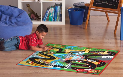Disney Pixar Cars racing rug features scenes from the Cars 2 movie. Printed nylon interactive play rug is 31.5 x 44 Inch. Serves as play rug and room décor. Includes Lightning McQueen car and Mater truck. Durable and easy care.
