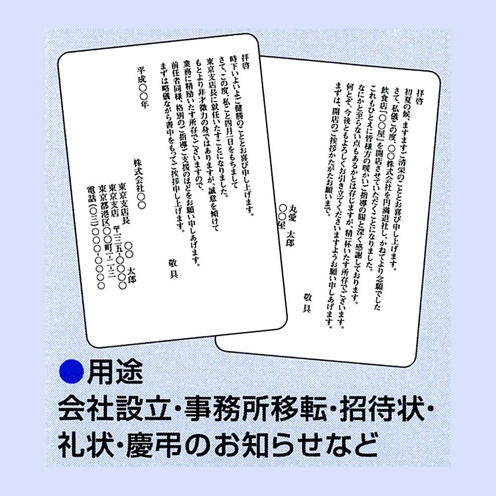 It is a postcard for greeting cards and invitation cards that can be used for business scenes such as company establishment, office relocation, wedding ceremonies, legal requirements etc. for personal scenes.