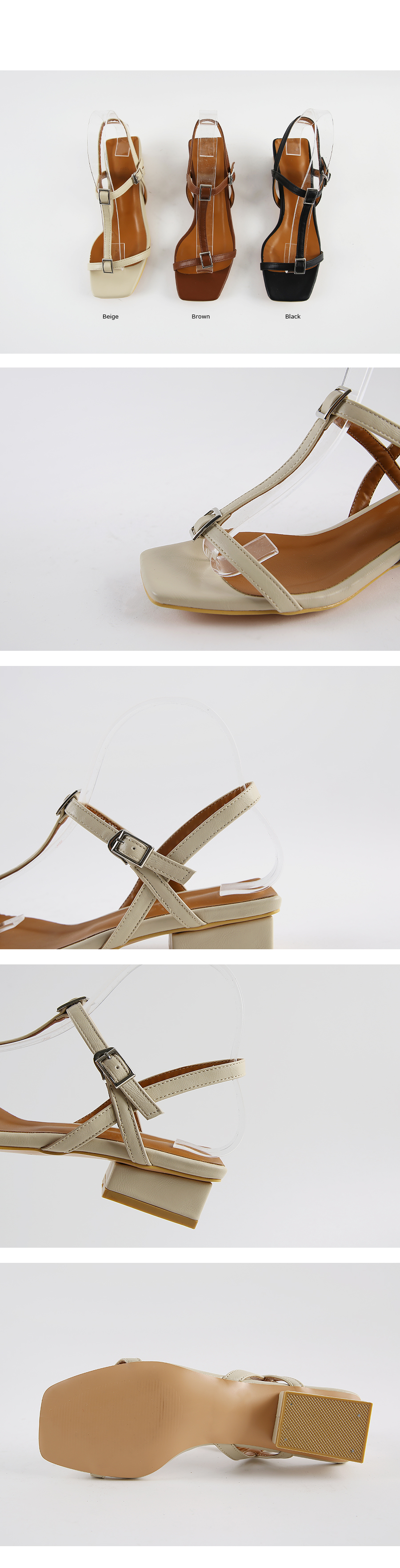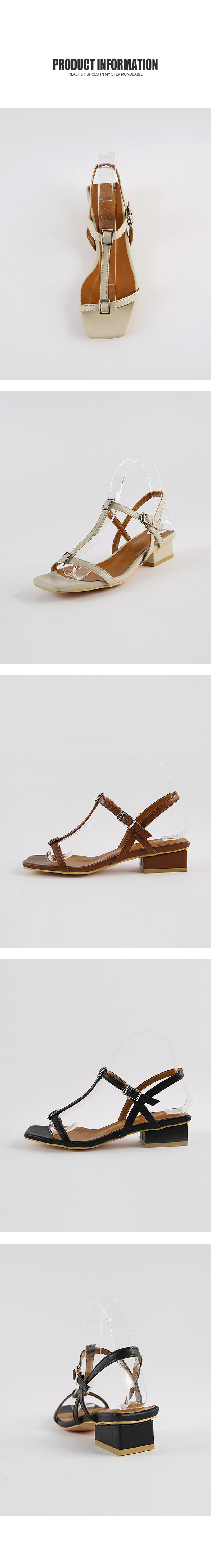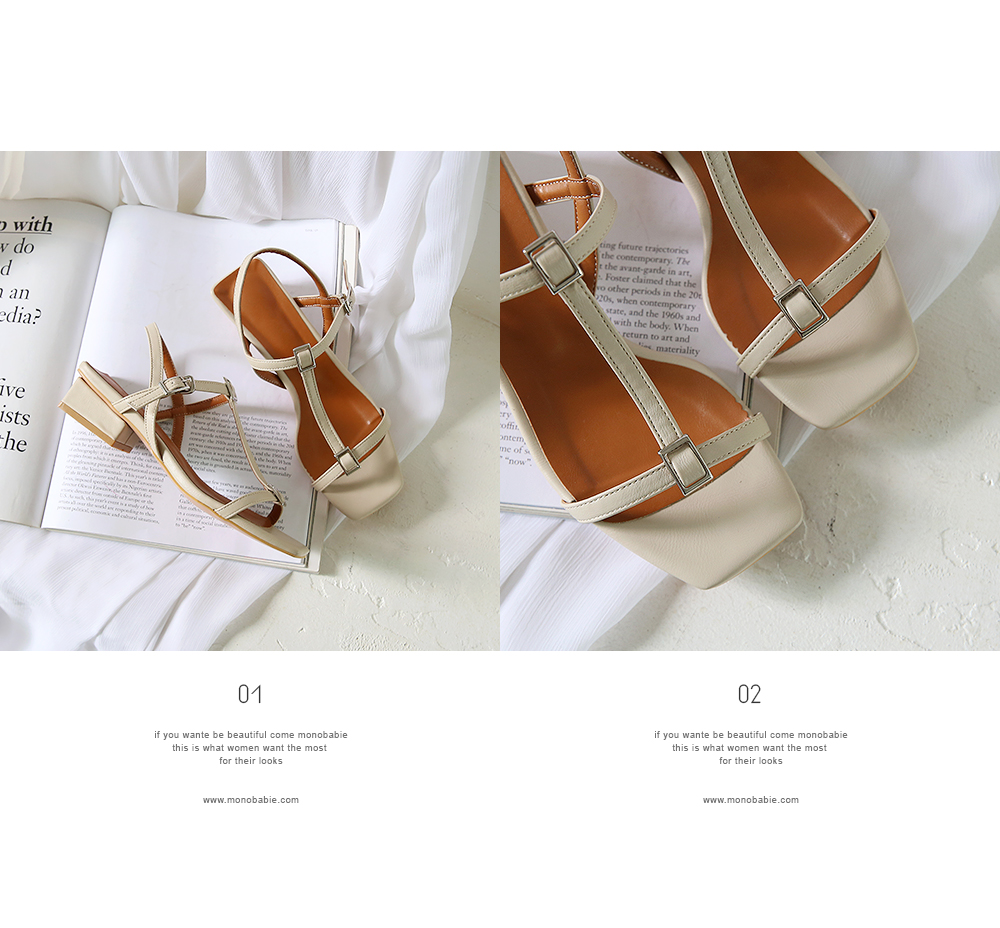 각진 쉐입에 t스트랩 중간마다 걸려있는 스퀘어오브제로 심심치않게 포인트주었으며 전체적으로 많이 오픈된 디자인이지만 슬링백스트랩이 발전체를 고정시켜줍니다.