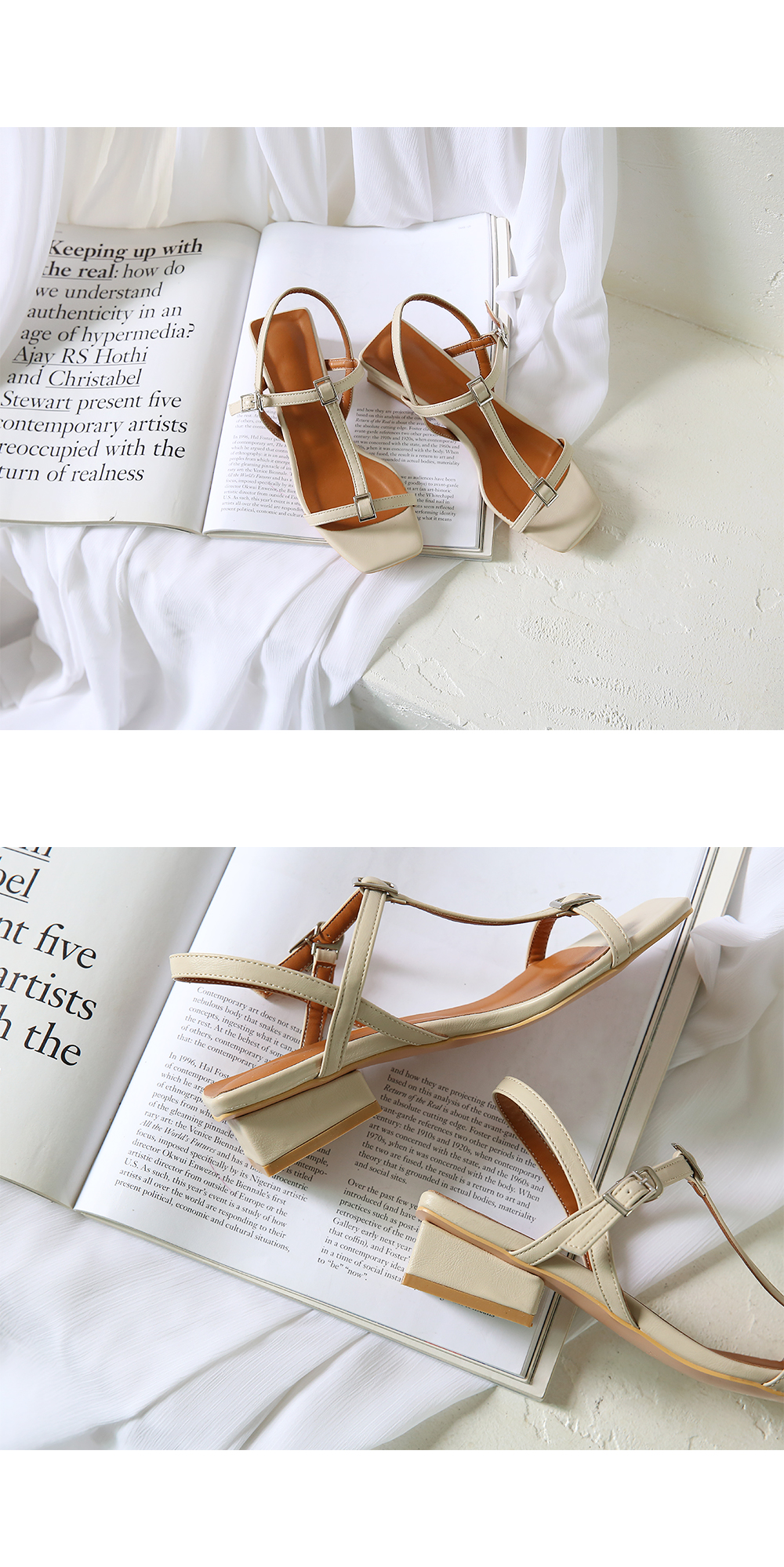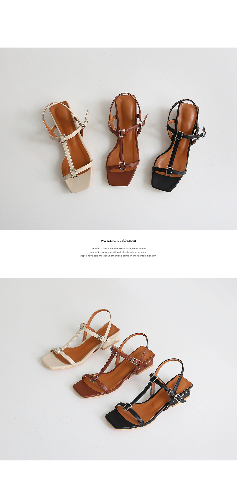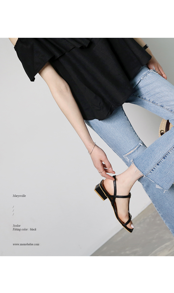 각진 쉐입에 t스트랩 중간마다 걸려있는 스퀘어오브제로 심심치않게 포인트주었으며 전체적으로 많이 오픈된 디자인이지만 슬링백스트랩이 발전체를 고정시켜줍니다.