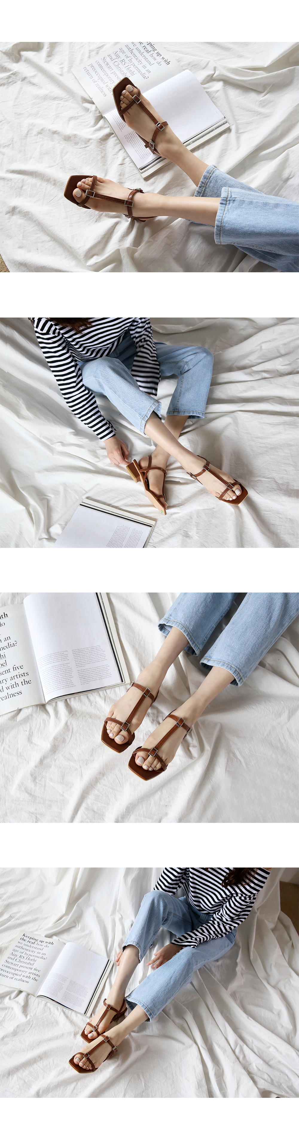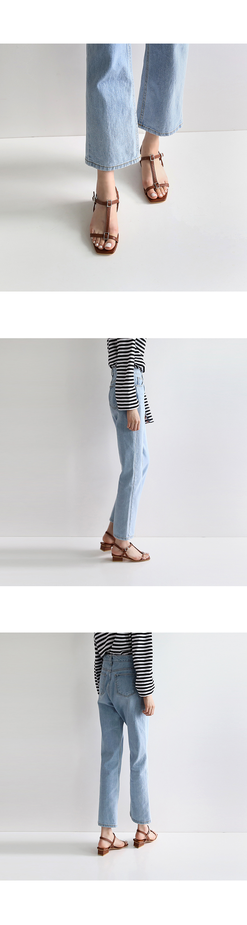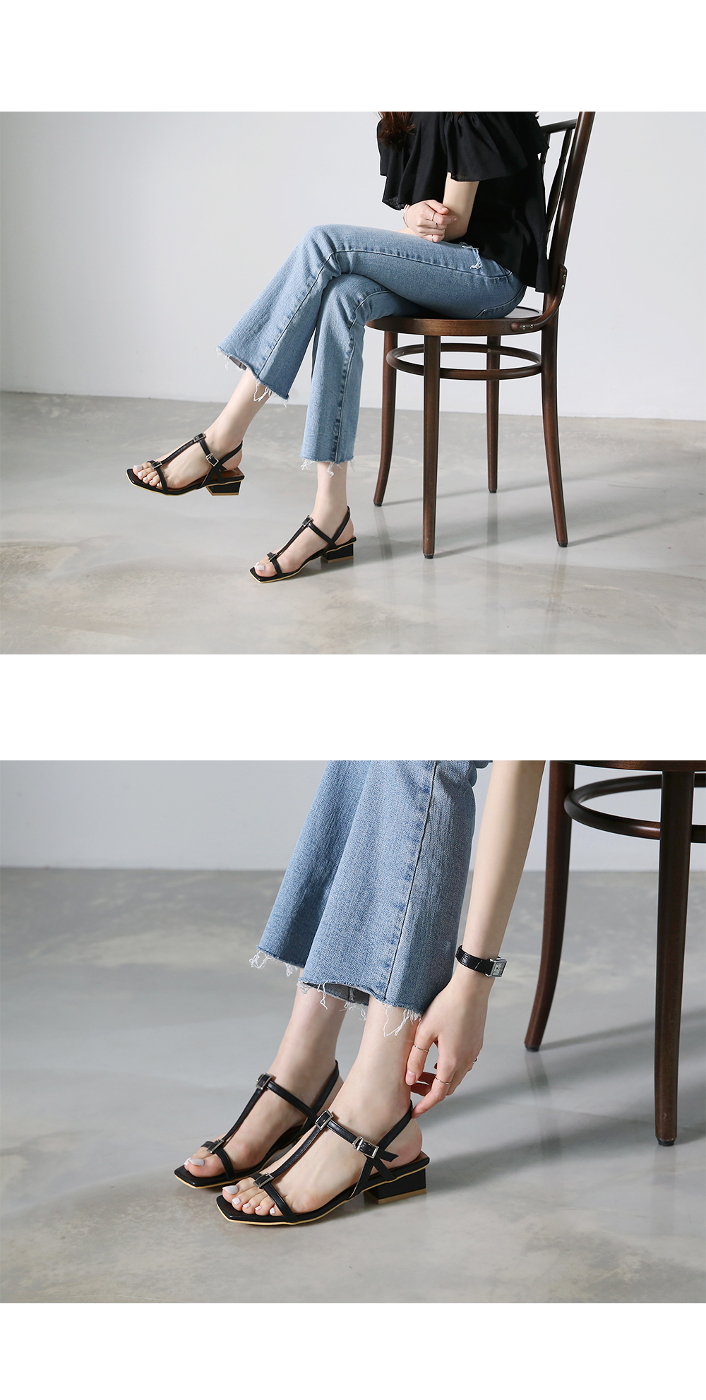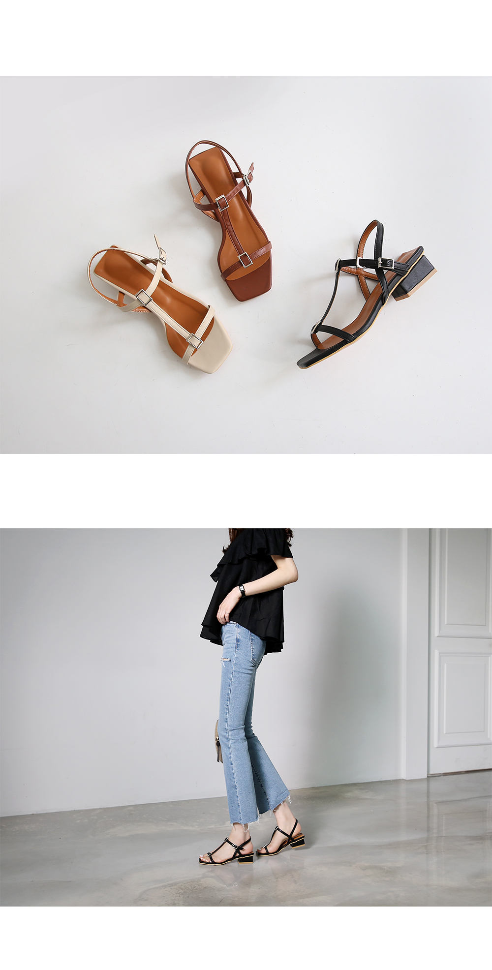 Square toe T strap sandals.