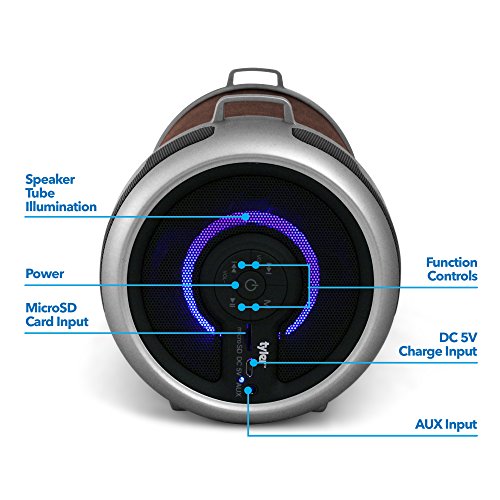 -. Feature : Huge Stereo Sound: Enjoy crisp, clear audio with impressive volume powered by dual watt drivers. Combined 11W output the highest available in this P.R.Ice range. / Bluetooth 4.0: Instant pairing and voice prompts let you easily connect to your smartphone or tablet over a 33-foot distance. It remembers the last eight devices used, so reconnecting is automatic. / Booming Bass: Features MaxxBass technology and two passive subwoofers for enhanced bass performance. Hear the soaring highs and deep lows of all your favorite tracks. / 8 Hours of Music: Play up to 160 songs at 50% volume before needing to recharge. With Micro SD Card Support, FM Radio, and Auxiliary Line-In (3.5 mm) for non-Bluetooth devices. / What You Get: Tyler Portable Wireless Premium Stereo Bluetooth Speaker, Micro USB cable, 3.5mm audio cable, welcome guide, carrying strap for easy portability, and 1 year warranty!