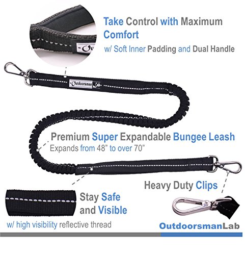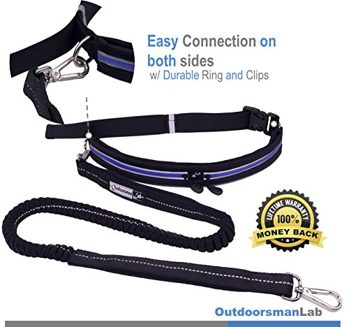 - Feature : ENJOY 2 GREAT PRODUCTS AT THE PRICE OF 1: Functional waterproof running belt (fits waist 26" to 42") with 2 large pockets fit iPhone 6+ and Samsung S6 combined with strong, durable padded dual handle bungee leash for running, jogging, hiking or any activity you enjoy doing with your pet. / TOTAL CONTROL WITH PERFECTLY SPACED RUNNING ROOM: Elastic dual handle bungee leash with SOFT PADDING ensures you have control over your pet at all times. Easy clip-and-go system on both sides of the running belt and bungee expandable from 48" to over 70" ensures ideal running room. / REDUCE INJURE, FATIGUE & IMPROVE POSTURE: OutdoorsmanLab hands free dog leash eliminate unwanted stress, keep your arm swing, and maintain upright posture by utilizing your waist and save energy for longer run, walk, jog, or hike. / WEATHER-PROOF MATERIAL WITH REFLECTIVE THREAD: Enjoy activities in all weather with our waterproof running belt and durable bungee leashes to ensure its use for years to come. To keep you safe and visible when the sun goes down we added reflective coatings on both the belt and bungee leash / 100% MONEY BACK GUARANTEED: when you order today, you're protected by our 60 day, no-questions asked, money back guarantee and world class customer service. Get Yours TODAY!