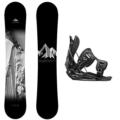 Studio : System Publisher : System Product Description System Timeless and Flow Men's Snowboard Package : System's Timeless Snowboard is paired with Flow's Alpha MTN binding! Featuring System's Timeless snowboard designed to float in powder, power through trees and still handle park laps for day, this thing is a powerhouse. Then we include the speed and ease of Flow bindings! No sitting down and buckling straps, just slide your foot in and ride! System Timeless Snowboard : The newest board in System's line, the Timeless is a snowboard guaranteed to live up to it's name! Built around the strongest and livliest core System has, the 3D Core with Edgelock is full tip to tail poplar with high density stringers running just outside the center of the board as well as down each rail, easily driving and holding your edge in to any snow conditions! Then an artisan grade heartwood stringer is set in the center of the board creating explosive power and response from the park to big mountain carves! This is all then pressed in to their new CRCX camber profile! The Timless is a rocker dominant "camber-rocker-camber" profile which greatly increases float in powder and elevates your contact points to ensure you never catch an edge. The small cambered sections in the nose and tail only engage when you tell them to, and create explosive pop for ollies and jumps. Flow Alpha MTN Bindings: Featuring Flow's patented super easy rear entry, forget sitting down and tightening ratchets to strap in. These bindings blend together insane ease of use and unparalleled performance. An upgrade to the Flite models of Flow's previous seasons you cant go wrong with the Alpha MTN. EVA padded footbeds and hibacks, locking micro ratchets and full adjust-ability will make this the most comfortable and easy to use binding you have ever ridden. 0
