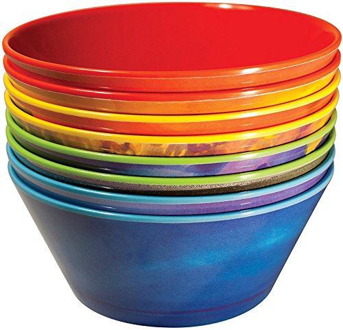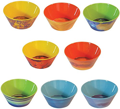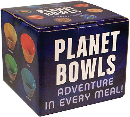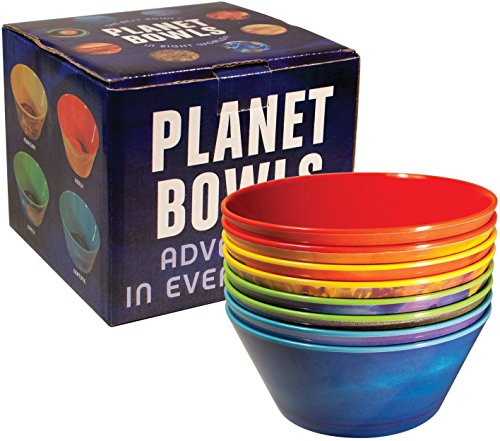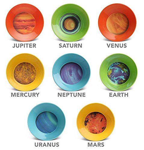 If you think our Planet Plates are dreamy, you will love this complete set of eight bowls featuring the same original solar system watercolor portraits. Now any meal can be an interplanetary odyssey. These beautiful Planet Bowls are sturdy enough for the kids' table and worldly enough to travel in grown-up circles. Chicken noodle soup, beans and rice, curry, chili, hearty stew... you name it, you'll want to get to the bottom of it because the planet appears in the bottom of the bowl. Ponder the cosmos over your oatmeal. Serve extraterrestrial sukiyaki! Make that weird snack your great-aunt used to make over the stove with breakfast cereal, garlic powder, butter, and nuts - were there nuts? She was an odd bird, your great-aunt. Anyway, it will be better when you pour it into all eight Planet Bowls (why did she always have to make so much?) Contents: Mercury, Venus, Earth, Mars, Jupiter, Saturn, Uranus, and Neptune. (Pluto not included.) 100% melamine. Dishwasher safe. Do not microwave. Approx. 5-½" diameter, 2" tall. Holds 16 oz. Shipping Note: Shipping to Alaska, Hawaii, PO Boxes and APO addresses not available for this itemFeature