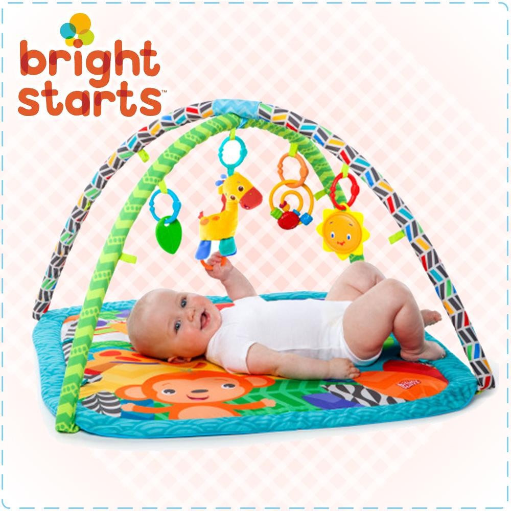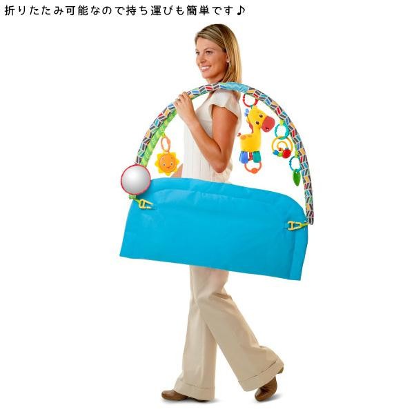 | どうぶつたちが描かれたカラフルなマットと5つのおもちゃがセットになった『アクティビティジム』。きりんさんのメロディトイはリングを引っ張ると、楽しくなる4つのメロディが流れます♪ |