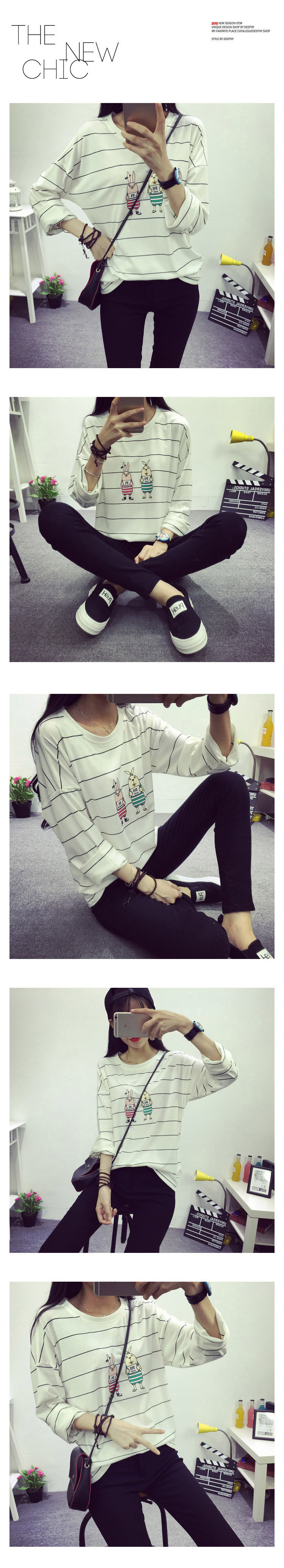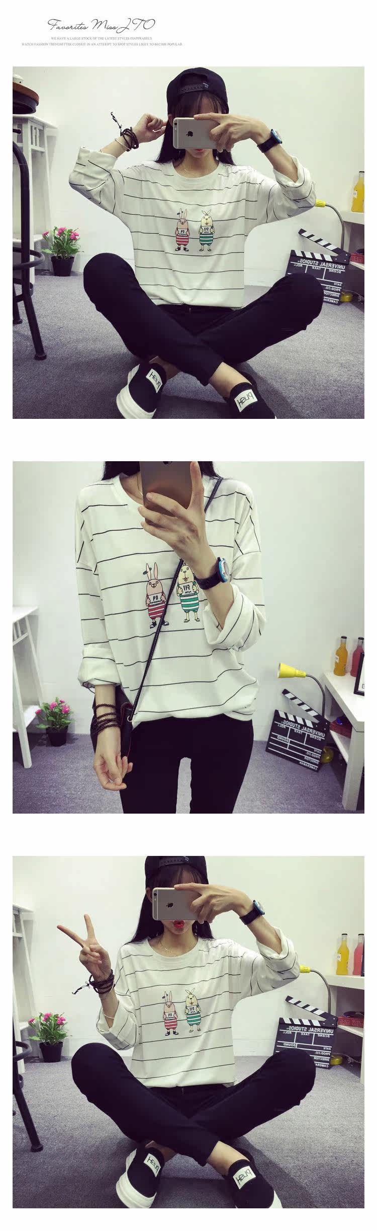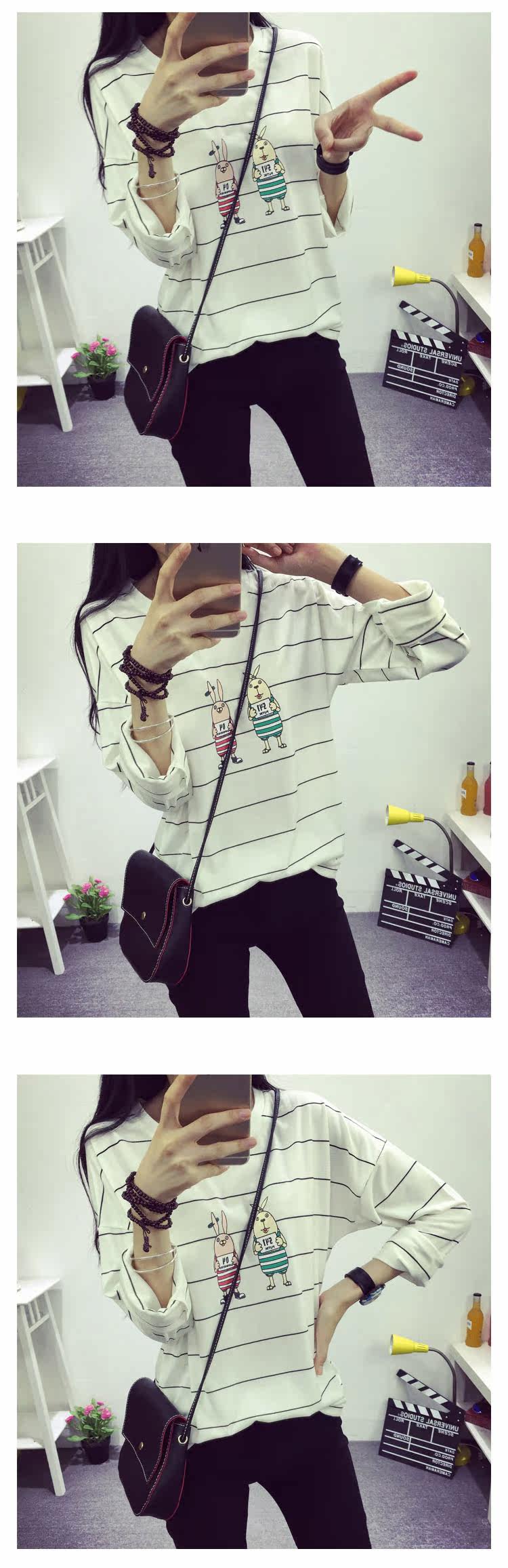 长袖T恤女2016秋冬新款韩版薄款棉质宽松时尚少女条纹体恤打底衫