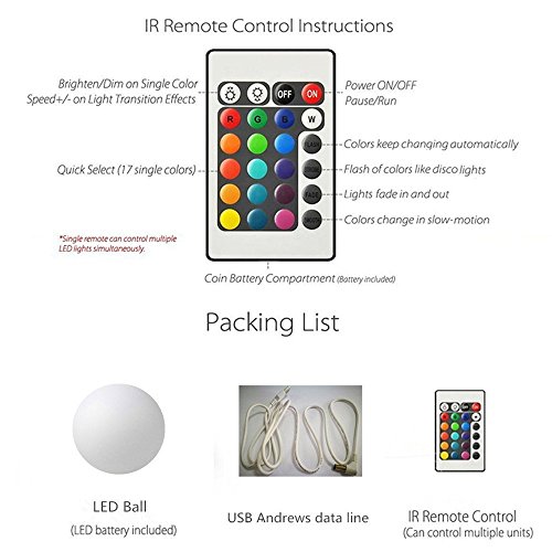 Features: Multiple colors LED ball light which has built-in rechargeable battery Support total 16 different color tones and 4 flash modes - flash, strobe, and fade, smooth.