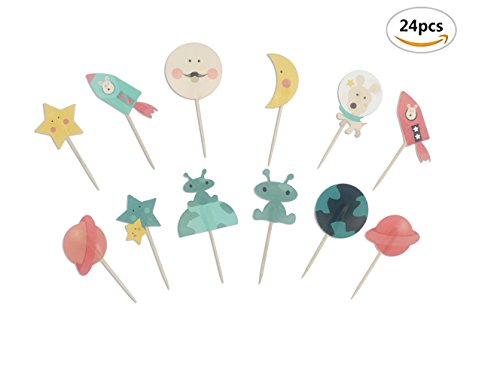 24pcs Outer Space Dog Cupcake Toppers Rocket Themed Party Aliens Cake Decorative