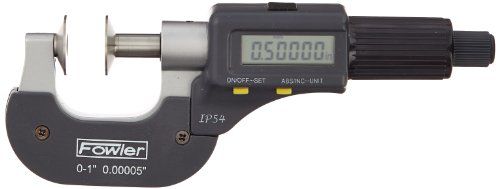 - Digital outside micrometer with choice of measuring range and disc-style anvil/spindle pair measures thickness of narrow grooves and difficult or closely spaced areas, such as slots and recesses