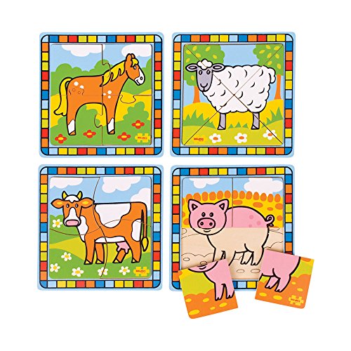 -. Binding : Toy -. Brand : Bigjigs Toys -. EAN : 0783327905257 -. Feature : Bigjigs Toys My First Farm Puzzles is a fun activity for very young children / Set features 4 puzzles with appealing designs and thick pieces that are easy for small hands to hold / Teaches children color and shape matching, helps develop vocabulary and concentration / Each puzzle includes 4 pieces and measures 5.8'' x 5.8'' - suitable for ages 1 and over / Silk-screened on wood; puzzle conforms to ASTM and CPSIA safety standards -. IsAdultProduct : 0 -. Label : Bigjigs -. Manufacturer : Bigjigs -. Model : BJ382 -. MPN : BJ382 -. PackageQuantity : 1 -. PartNumber : BJ382 -. ProductGroup : Toy -. ProductTypeName : TOYS_AND_GAMES -. Publisher : Bigjigs -. Studio : Bigjigs -. Title : Bigjigs Toys BJ382 My First Farm Puzzles -. UPC : 783327905257 -. Warranty : 30 day warranty against manufacturer defects