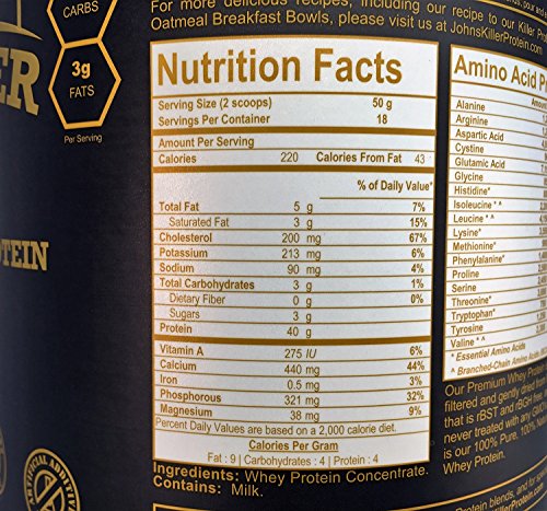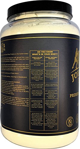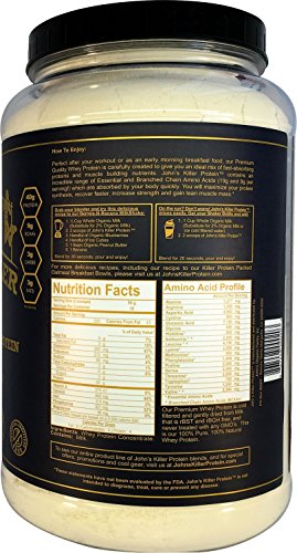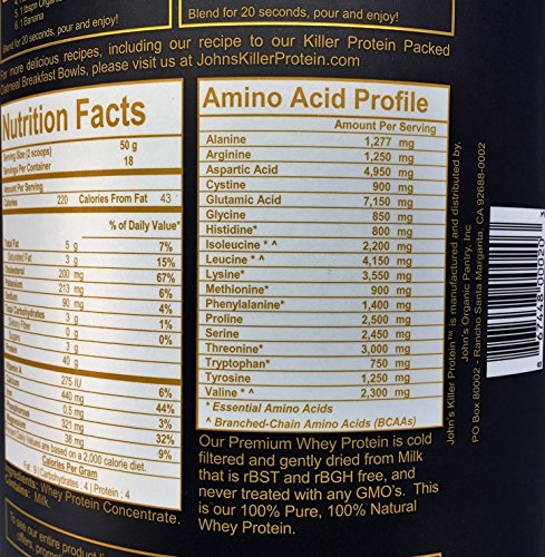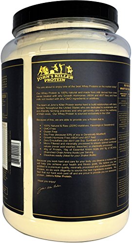 -. Binding : Health and Beauty -. Brand : John's Killer Protein -. EAN : 0867448000203 -. Feature : 100% Natural and Lecithin Free: We are proud to offer you our Premium Blend Whey Protein that is 100% Natural and contains ZERO Additives, ZERO Flavorings and ZERO Sweeteners. We never use Lecithin in our products (Soy or Sunflower Lecithin) as fillers or lsifiers / Certified Soy Free: This Premium Blend Whey Protein is 100% Soy Free - because market research tells us that over 93% of Soy is genetically modified / Certified GMO and Gluten Free: This Premium Blend Whey Protein is Certified GMO Free and Gluten Free / Certified rBGH and rBST Free: We strictly use ingredients derived from cows never treated with any Growth Hormones / Minimally Processed: Micro filtered to ensure optimal nutritional values. We never acid wash, bleach, or chemically process any of our ingredients as is commonly done with cheaper and mass produced protein powders. This allows us to provide you our Premium Blend Whey Protein with a Protein-Digestibility-Corrected-Amino-Acid-Score (PDCAA) of 1; The highest score possible as set by the FDA. A single serving will give you 40g of Protein, 19g of Essential Amino Acids and 9g of BCAA's -. IsAdultProduct : 0 -. Label : John's Organic Pantry, Inc -. Manufacturer : John's Organic Pantry, Inc -. MPN : JKPWPC5916 -. PackageQuantity : 1 -. PartNumber : JKPWPC5916 -. ProductGroup : Health and Beauty -. ProductTypeName : HEALTH_PERSONAL_CARE -. Publisher : John's Organic Pantry, Inc -. Studio : John's Organic Pantry, Inc -. Title : JOHN'S KILLER PROTEIN - PREMIUM WHEY PROTEIN. Our 100% Natural & Unadulterated Whey. GMO Free, Gluten Free, Soy Free, Lecithin Free, Growth Hormones Free Sweeteners and Artificial Additives Free. -. UPC : 867448000203