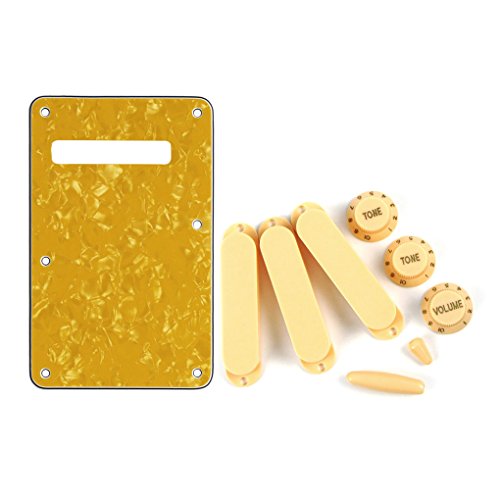 Studio : iknmusic Publisher : iknmusic Product Description Feature: * Set of Gutiar Back Plate, Pickup Covers, Knobs and Tips for Strat Style Gutiar or similar replacement.* All materials are environmentally friendly, thermostability, no smell. Multi-layer plates are pressed under high temperature and pressures, to make them close integration between each layer, will not appear curly, deformation, or separation of different layers.Two layers of protective films on the front of Back Plates, anti-scratch to protect the back plate.Specification:* Item: Back Plate Pickup Covers 2T1V Knobs 5 Way Switch Tip Tremolo Whammy Bar Tip.* Back Plate: L 145mm, W 93mm; Pickup covers: Closed style, no pole piece holes for single coil pickups; * Knobs: 2Pcs Tone and 1Pcs Volume Control Knobs; Switch tip: for 5 Way Strat Style Guitar switch or similar; Whammy Bar Tip: for Single Tremolo System normally* Material: Back Plate: Made of 4Ply, 3Ply PVC and 1Ply Pearl Celluloid Plate. Guitar Parts: Plastic PVC* Color: Back Plate: Yellow Pearl; Guitar Parts: Cream.* Back Plate is with protective film on the surface, while using please split it off.* Note:Item's color might be different from the picture because of the aberration.Package Includes:1 x Back Plate3 x Pickup Covers2T1V Knobs1 x Switch Tip1 x Bar Tip 0