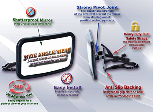 SAFETY: Our superior wide angle view allows you to keep your eyes on the road while getting split second updates on your baby. Check in anytime to see if your baby is sleeping or if you need to make sure s/he is not choking, sick, or getting overheated from direct sunlight. Our mirrors our 100% shatterproof, have been crash tested, and have heavy duty safety straps that ensure maximum mounting security.