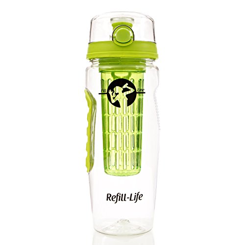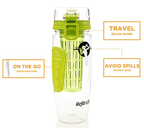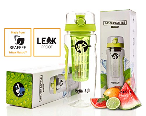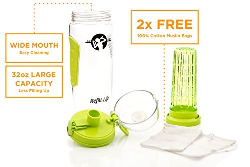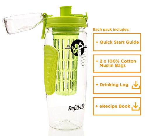 -. Feature : SAFE TO USE Master refreshing, fruity water infusions packed with natural goodness and flavor with our clear 32 oz fruit infusing water bottle made from the finest BPA free vegetable based clear Eastman Tritan plastic, tested to be FDA safe for use with foods and beverages / LEAK PROOF GUARANTEE with every bottle. Our fruit infuser water bottle is engineered carefully to seal in liquids. So if our bottles leak, we'll refund you your money ... Simple / EASY INFUSING: We find that a 1/2 filled sleeve will last for 2-3 infuse refills. Enough to meet your daily hydration needs. With the exclusive dual strainer and sleeve, you can put fruit on the outside of the diffuser for more fresh flavors. Add lemon, blueberry, cucumber, raspberry, watermelon, ginger, grapefruit, melon, strawberry or mint to your beverage infusions. / VERSATILE WATER INFUSER BOTTLE: Drink water on-the-go using the activated flip-top lid and comfy neoprene hand grip. Create infusions that pack a punch following our Quick Start Guide and eRecipe book. Fits most cup holders / WHEN YOU ORDER TODAY get 2x FREE Muslin Bags (for water without the bits), our downloadable Water Tracker Challenge, our 30 day money back guarantee and FREE delivery when you buy 2 or more bottles. Check out our special multi-buy deals below