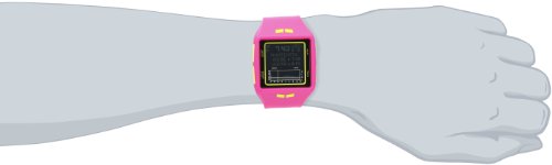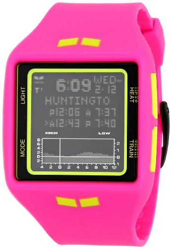 -. Feature : Square pink sport watch with yellow logos on band and customizable beach settings / Quartz movement with digital display / Protective plastic dial window / Features train mode, heat mode, alarm, future tide mode, T1 and T2 time tracking, backlight, and buckle closure / water resistant