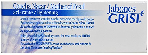 3 Soaps - Grisi Soap Concha Nacar, jab?other of Pearl, helps reduce small skin spots on the skin with of the combination of concha nacar, mother of pearl powder, and vitamin C. Grisi Soap Concha Nacar leaves your skin silky, smooth, and moisturized. Grisi Soap Concha Nacar, jabon Mother of Pearl Net weight 3.5 OZ, pack 12/12. UPC 0-37836-00026-3 Grisi's Mother of Pearl Soap contains ingredients that help regenerate and stimulate the skin. It has small particles of the sea shells (where pearls come from) that when in touch with the skin, cleans and helps it rejuvenate, by exfoliating and nourishing the skin. In combination with Grisi's Mother Pearl cream it helps reduce and in some cases eliminate many skin spots (skin spots maybe caused by different things so it may not work on all skin spots). Mother of Pearl also helps reduce scars from cuts, burns and acne. As it penetrates the layers of skin, it reacts to eliminate dirt, grime and bacteria, even reduces skin oils or fats, so that they do not accumulate. Mother of Pearl soaps does not leave the skin dry because of its emollient properties, it hydrates the skin. For healthy nourishing skin, use Mother of Pearl Soap. El jabón de Grisi de Concha Nacar es excelente para regenerar y estimular la piel.Feature