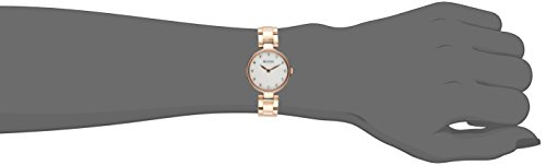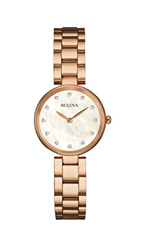 Bulova 96A185 Diamond women's watch features a 27mm wide and 6mm thick rose gold ion plated solid stainless steel case with a fixed bezel and textured push-pull crown. Bulova 96A185 is powered by quartz movement. This beautiful watch also features sharp looking white mother of pearl dial with rose gold tone luminous hands and 12 diamonds accented index hour markers, scratch resistant mineral crystal and water resistant to 30 meters. Bulova 96A185 is equipped with a 12mm wide rose gold ion plated solid stainless steel bracelet with a deployment push button clasp. Bulova 96A185 women's Diamond MOP dial rose gold steel watch is brand new and comes in an original Bulova gift box and is backed by a 3 year limited warranty.Feature