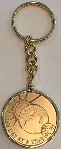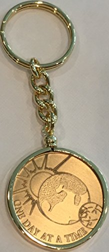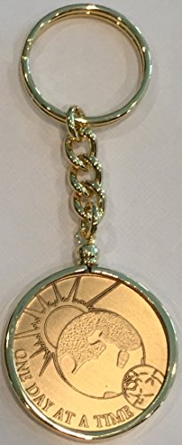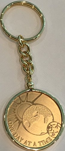 One Day At A Time Universe Medallion with 18k Gold Plated Keychain that allows you to insert and remove medallions. You can change out the coin as you see fit. Coin is a standard recovery chip size 33mm or 1 5/16" 14 gauge and that is what the keychain will hold. Just unscrew the bezel and insert a coin and screw it back on. Great sobriety gift set. Coin was made in the USA.