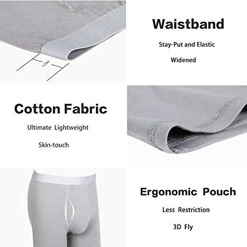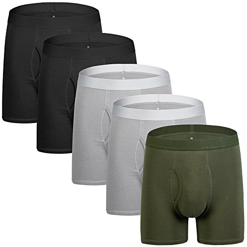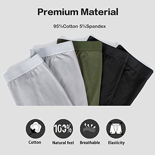 -. Feature : Mens boxer briefs Design: Long leg men's underwear to avoid the legs riding up ; Sports underwear can stretches in every direction, allowing for full motion with recovery. / Boxer briefs Waist Band: The 1.35 inch widened elastic band of men's boxer briefs give you the greatest comfort and environmental tagless,the high waisted underwear offers no scratchy and itch-free feel. / Men's Underwear Pouch: 3D pouch with open fly underwear for men provides more space and boxer shorts keeps man's P.R.Ivate area. / Washing Tips:This kind of cotton men's underwear can be washed in machine,the color of kids underwear will not fade away,while mens compression underwear need to avoid washing with light-colored clothes. / Men Underwear Package: 5 pack of boys underwear bag in 3 assorted colors,dark black/gary/army green;which is a great gift choice for your men and boys.