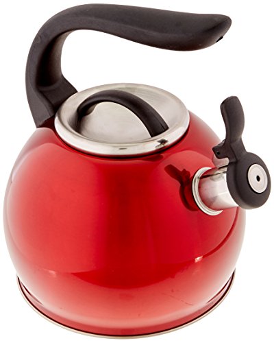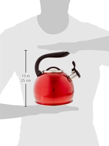 Beautiful metallic red colored stainless steel whistling kettle with flip-up spout cover for safe and easy pouring. Unique reverse grip ergonomic stay-cool handle and knob provides one-hand operation while giving you a modern look in the kitchen. Ideally use on oven tops.Feature