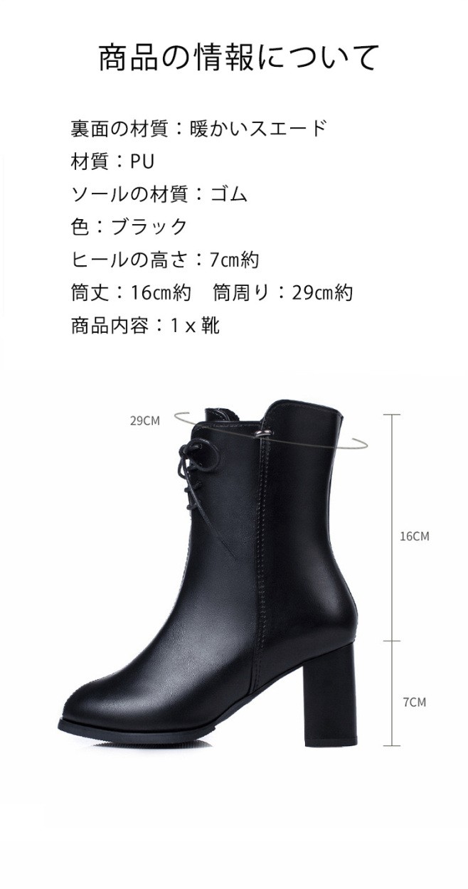 裏面の材質:暖かいスエード材質:PUソールの材質:ゴム色:ブラックヒールの高さ:7cm約筒丈:16cm約 筒周り:29cm約商品内容:1X靴サイズ:34:22cm 35:22.5cm 36:23cm 37:23.5cm 38:24cm 39:24.5cm 40:25cmショートブーツレディース ヒール 女性のアンクルブーツ シューズ ファスナー式靴 秋冬物 シンプル くつレディース用のアンクルブーツが登場カラーもシルエットもとても組み合わせしやすくて、どんな場合にも使える上品な一足