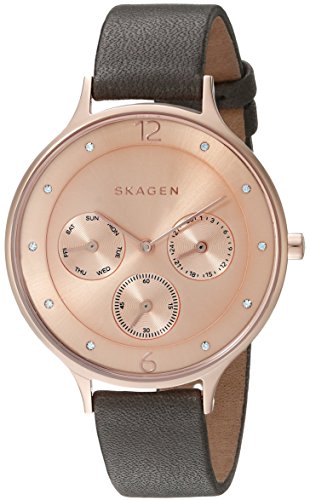 This watch features a gray leather strap and round rose gold tone stainless steel case of 36mm. Rose gold tone chronograph dial with crystal markers three sub dials and logo. Quartz movement. Water resistant to 30 meters.