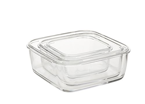 Set contains three square containers: 1.6 cup (12.8 ounce/380 ml); 5 x 5 x 2.4" (130 x 130 x 62mm), 3.2 cup (25.7 ounce/760 ml); 6.3 x 6.3 x 2.7 " (160 x160 x 68mm), 5.2 cup (41.3 ounce/1,220 ml); 7.3 x 7.3 x 2.9" (186 x 186 x 74mm)