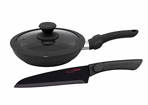 Slicing and frying is a breeze with the Perfect Grip 8.5 inch fry pan and 8 inch chef knife in black. Both pieces feature CeraStone's TPR, ergonomically designed handles for heat and slip resistant comfort while you prepare a meal. The titanium ceramic coating makes both easy to clean and dishwasher safe, while the fry pans induction bottom ensures versatility among cooktops.Feature