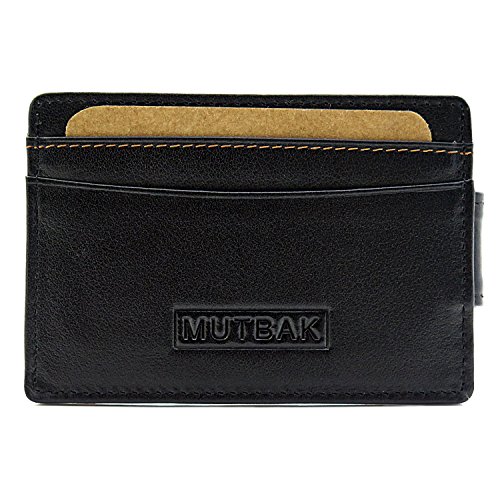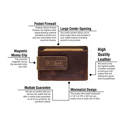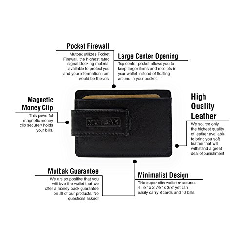 -. Binding : Apparel -. Brand : Mutbak -. ClothingSize : Thin -. Color : Parent -. Department : mens -. Feature : Best RFID blocking money clip wallet keeps all of your Credit and Debit cards protected. / Minimalist designed and super slim. Measures in at 0.375" thick. / Holds 8 credit cards and 10 bills with a leather lined magnetic money clip / Top Grain Vegetable Tanned Leather and High Quality Nylon Stitching that lasts. Includes top center pocket for use as a receipt holder, for cash or extra credit cards. / One-year unconditional warranty for all Mutbak products. Here is what some of our customers have to say: "I can no longer tell that I have my wallet in my pocket without feeling for it", "The wallet successfully blocks the RFID card it amazed me a bit on how well it worked.", "Overall, I really like this wallet. It met my need for something small, but pleasing to the eye", "Excellent quality - fantastic workmanship!" -. PackageQuantity : 1 -. ProductGroup : Apparel -. ProductTypeName : ACCESSORY -. Size : Thin -. Title : Money Clip Wallet Slim RFID Blocking Leather Front Pocket Wallet for Men