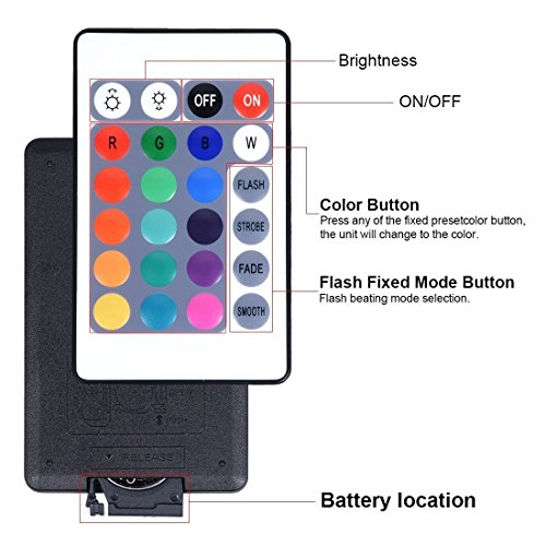 2. The security Light is equipped with remote control and has a built-in CR2025 button battery. Aiming the infrared receiver, receive signal distance is 5-8 meters. Functions of the light are as below: turn on/off the power, brightness control, RGB color change, static speed regulation, static color selection and power-off Memory.