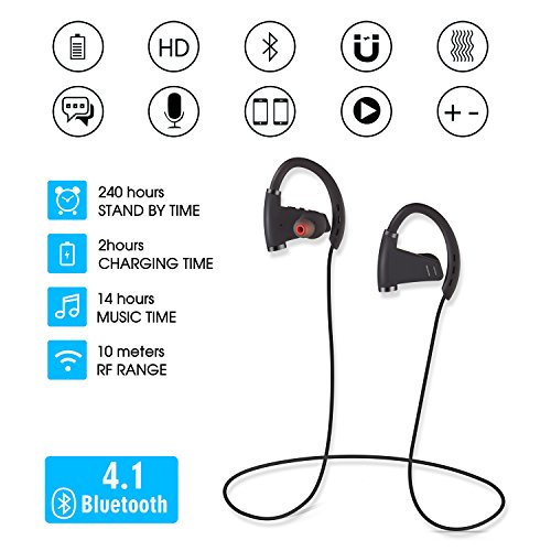 -. Feature : 1.High compatibility with bluetooth v4.1 wireless technology, headphone connect seamlessly with most of bluetooth enabled devices up to 33 feet away(depends on different conditions) / 2.Intelligent noise cancellation technology focus on your favorite music and answer calls without skips or missed words. Art acoustic components that produce incredible sound quality with deep bass and crystal clear treble. / 3.Powerful rechargeable lithium polymer battery allows seamless enjoyment of music for up to 14 hours and 240 hours stand-by with a quick charge of only 1.5 -2 hours. / 4.IPX5 Sweatproof - You can freely enjoy your music with the sweatproof headphone against dripping sweat, rain and even a splash from your sports drink. It is great for Gym, Running, Jogging, Hiking and Cycling. / 5.Active buds ergonomic construction and designed flexible ear hooks and gel flex silicone ear buds that ensure you wear the headphones comfortable and stay firmly in-ear while running, biking or gym