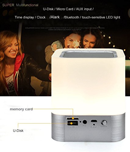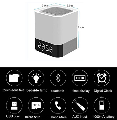 -. Feature : 4 IN ONE----Bluetooth Speaker + Sensor LED Lamp + Alarm Clock + MP3 Player . Easily and fast paired with Bluetooth 4.0, compatible with all Bluetooth devices; 3 Level brightness adjustable warm LED light with cool touch sensor design on the top; Big digital 12/24H Alarm Clock ,Alarm and Sleep mode;Can be use as MP3 Player with USB /micro SD Card input / With Large Capacity Rechargeable Battery---- It is build-in 4000mAh Li battery , Super long play / Wonderful Sound Quality ---- It is with High power woofer , Unique Bass technology,please don't miss it / Super Multifunctional ---- bluetooth , alarm clock ,cool LED touch lamp light ,support U-disk/Micro card , AUX input / Our bluetooth speaker can be used in many situations, such as in friends party, camping outside with family and friends, wedding, etc