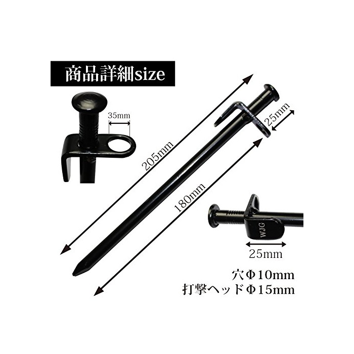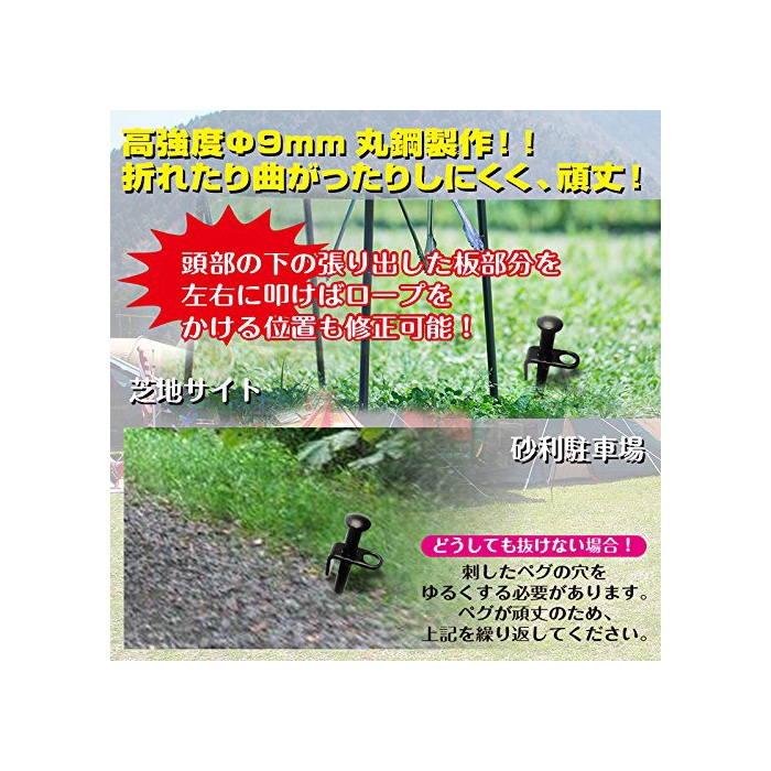 【특징】 해머로 깎는 헤드 형상은 원주형을 하고 있고, 타격시에 해머가 미끄러지기 어렵고, 타격력을 확실히 몸에 전하고, 강하게 견실하게 지면에 박아 넣는 일이 가능합니다.헤드가 지면에 처박히면 훅도 지면에 박히는 때문에,스테이《구》가 회전 하지 않고 로프가 빠지도 막는 것이 가능합니다. 이쪽의 상품은 딱딱한 지면,잔디밭에 적합했던 금속입니다.