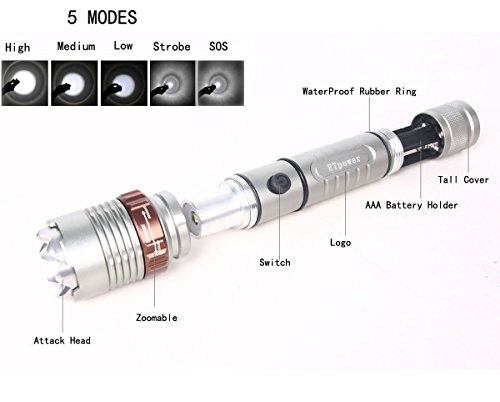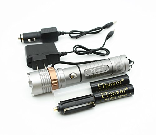 ETpower Powerful T6 LED Waterproof & Self-Defense Zoomable Tactical Flashlight(5 modes) Bundle with Two 18650 Battery, Car Charger and AC Charger