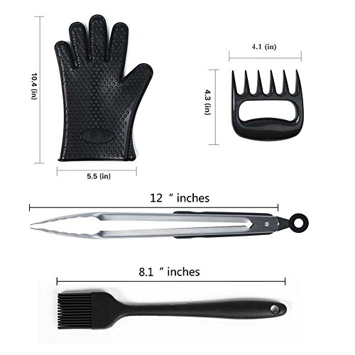 - ♥SUPER VALUE BARBECUE ACCESSORIES: Come with one pair of silicone gloves, two bear claws meat shredders, one silicone basting brush, one stainless steel tong.