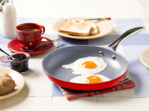 The Fiesta scarlet 11" open frypan adds a pop of color to any kitchen. It has a scarlet aluminum body with a stainless steel handle. Complete with Thermolon healthy ceramic non-stick coating in grey. Manufactured without PFOA and heat resistant up to 850oF, Thermolon is easy to clean and requires less oils and fats when cooking.Feature