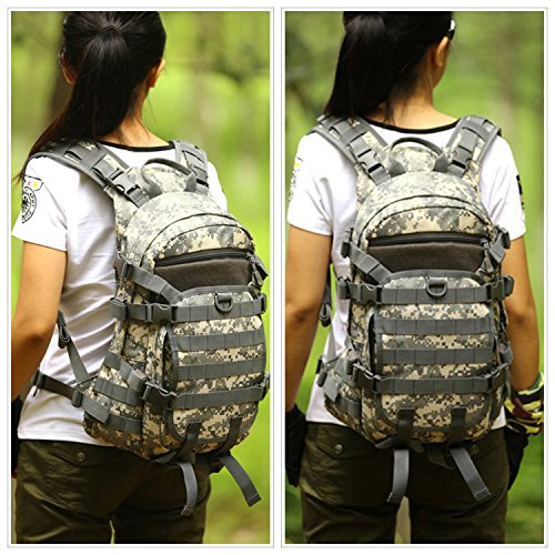 -. Feature : 25L Capacity,Dimensions: 12.6"W x 17.7"H x6.7"D,Main pocket:Height:17.7",Top Width:9.05",Bottom Width:12.6",Thickness(Min to Max):3.9"-5.1", Back top hydration bladder pocket:Can hold 2-2.5L water bladder. / High-intensity military-style specifications nylon, scratch-resistant, Not easy to fade, all the stitching and webbing, are used in military specification nylon material, longer straps slider, sleek, durable / MOLLE external expansion system designed to be used in combination with other equipment, you can load pockets, water bottle bag, accessory kits and other. / Front cover can attach the helmet,suitable for cycling.Front patch pocket fits for ipad mini,7.9inch laptop. / Suitable for sports fitness, outdoor travel, cycling,hiking, mountain climbing and other outdoor activities.
