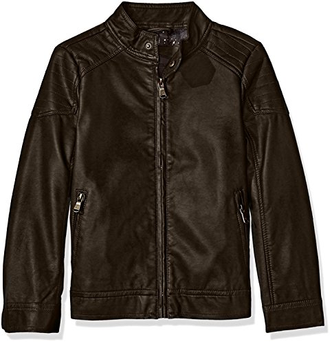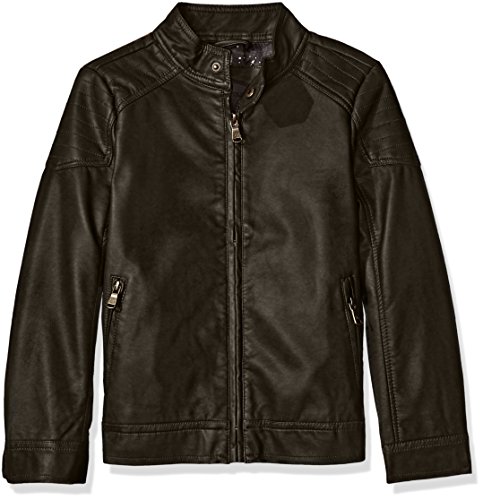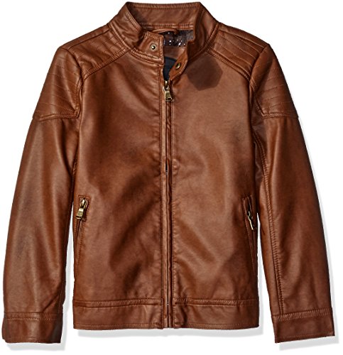 With this Faux leather moto jacket your boy will be very stylish. It has a stand collar with snap tab closue, long raglan sleeves with zip cuffs, a front zip closure and front zip pockets. If that is not enough, it also has a banded waist and trapunto stitched details at shoulders and back.Feature
