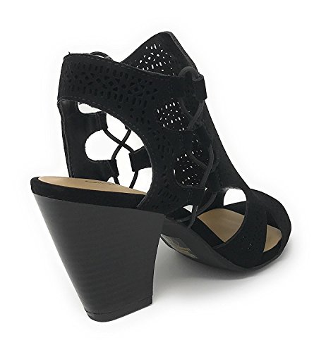 City Classified Open Toe Perforated Lace up Elastic Side Stacked Chunky Heel Sandal