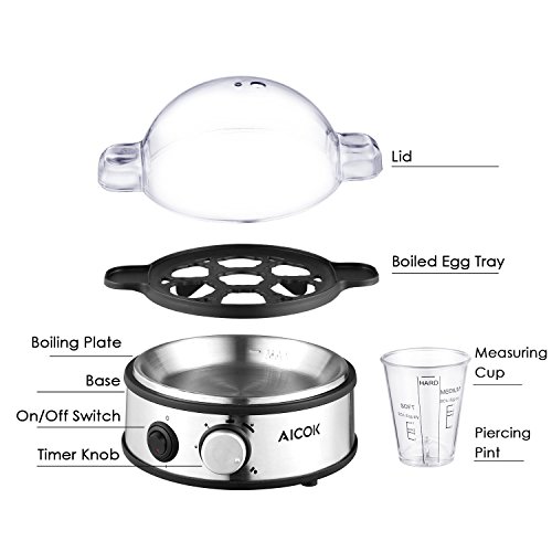 ⑤ 5-YEAR MANUFACTURER WARRANTY: Aicok guarantees 100% satisfaction replacement and refund within 2 years of purchase. Parts are BPA-free and dishwasher safe, 230V/ 50Hz/ 400W, rapid heating. It is includes a 7 egg holder tray, measuring cup, stainless steel base, boiling plate and recipe book.