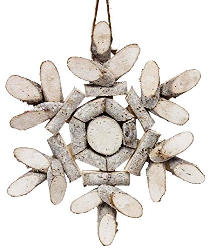 - A 12" wide snowflake ornament made of slices of birch wood painted with a white washed iridescent glitter finish. Ornament measures 12" wide. Jute loop hanger.