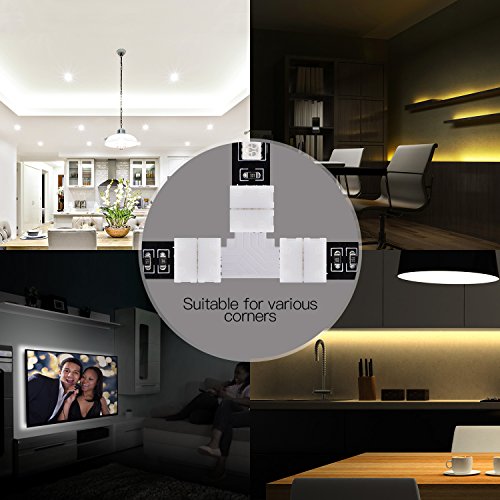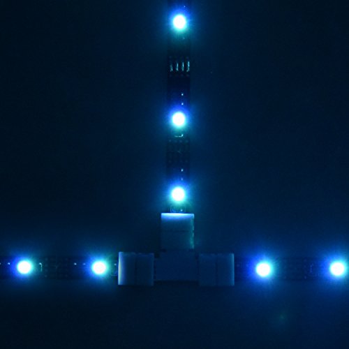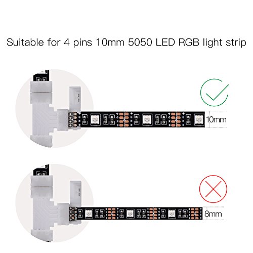 JACKYLED T shape 4 Pins Connector 10mm, comes in a Pack of 10 and can be used for both Waterproof & Non - Waterproof LED conductor. These solder-less connector are idea way to link two pieces of LED strip light together. The plastic connectors simply open up and allow 3528/5050 RGB LED strip to be inserted, once closed they provide a strong connection which will provide power to the LED strips. It fit for all the 3528/5050 SMD RGB Color Changing led strip with 10mm wide PCB board. It is NOT suitable for 8mm wide LED strip lights, so please check the width of your lights before buying.