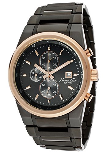 Studio : Kenneth Cole New York Publisher : Kenneth Cole New York Binding : Watch Product Description Dress watch, Japanese quartz movement, Chronograph featuring 12-hour, 60-minute and continuous seconds subdials, Polished rose-gold-tone hands with luminous accents, Polished rose-gold-tone chronograph sweep seconds, Polished rose-gold-tone hands mark subdials, Applied polished rose-gold-tone baton markers, Silver-tone Arabic numbers and indices mark subdials, Silver-tone indices form minute track, Silver-tone arbic numbers and indices form tachymeter scale on surrounding concave ring, Analog date aperture near three o'clock position, Matte black dial with brushed subdials and silver-tone logo below three o'clock position, Brushed gunmetal-ion-plated stainless steel bracelet with polished inserts, adjustable links and push-button-clasp, Polished rose-gold-tone stainless steel bezel, Polished gunmetal-ion-plated stainless steel round case, Textured rose-gold-tone steel crown, Polished rose-gold-tone steel selector buttons, Stainless steel screw-in caseback, Mineral crystal, 5 ATM (50 meters/165 feet water resistant) 0